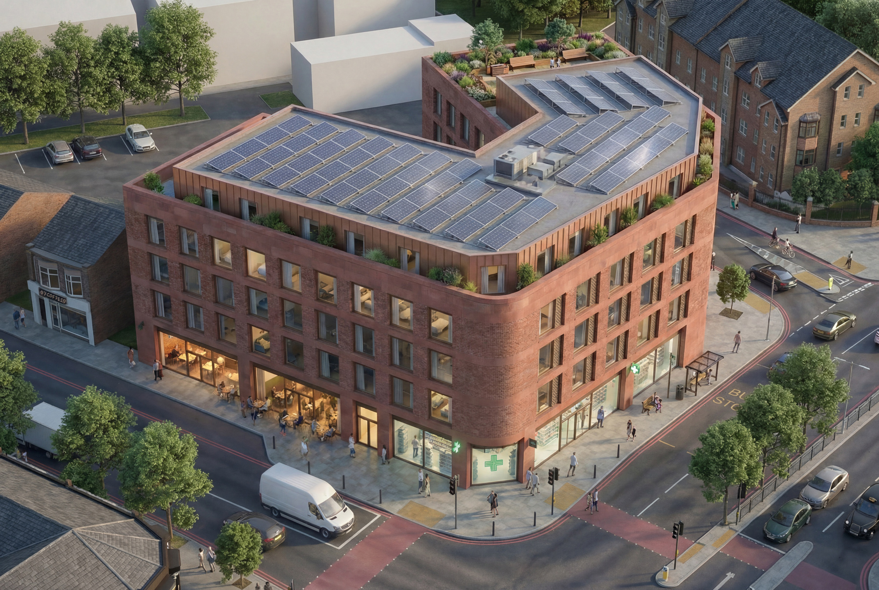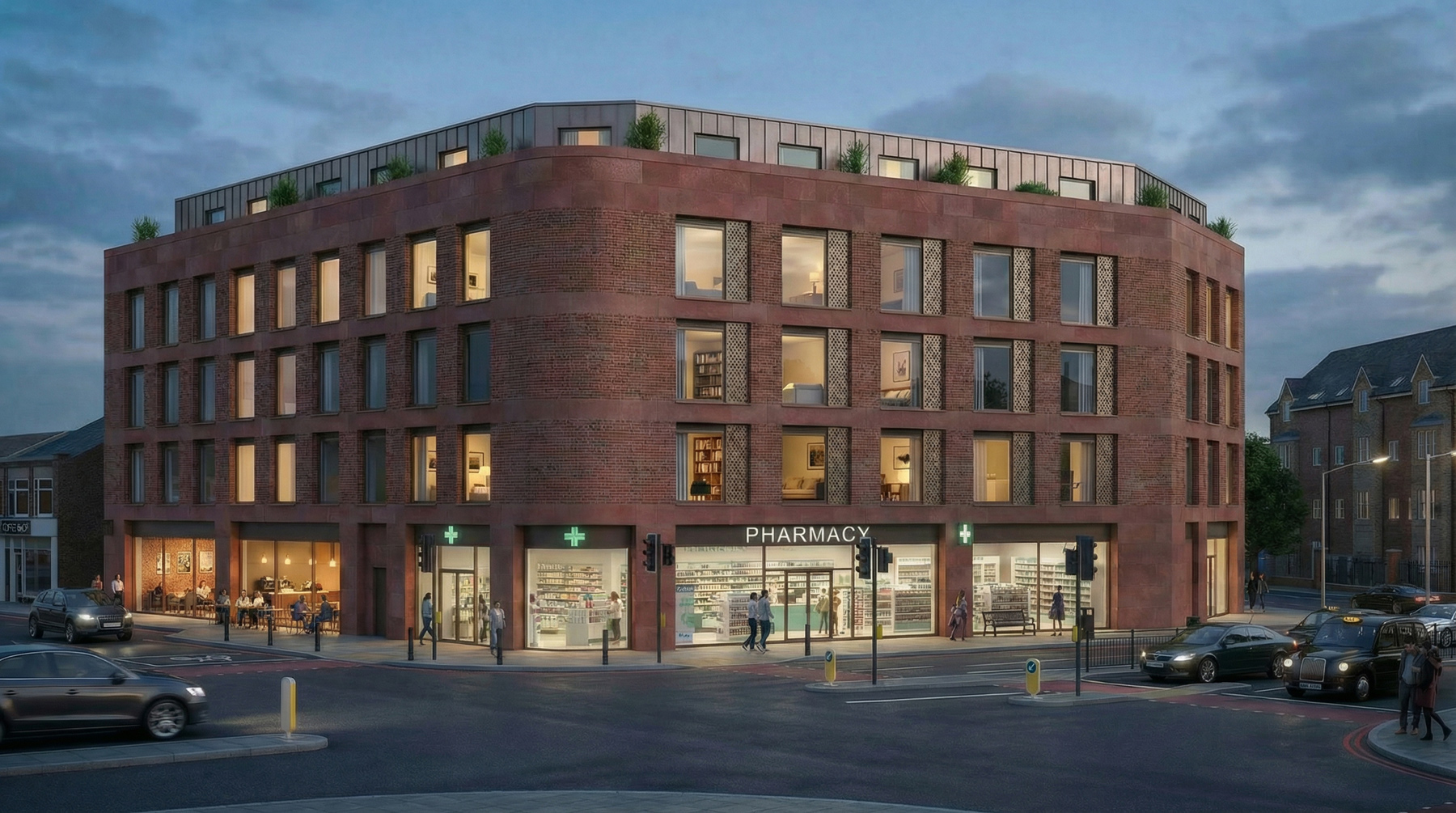 Landmark is a word that is often overused when describing architectural projects, but for generations Hans Renolds and the Renolds’ Chain Factory have been integral to the identity and rich industrial heritage of Burnage. We saw the design and redevelopment of Renolds’ Corner, adjacent to the former site of the Renolds’ chain factory, as an opportunity not only to respect and celebrate local heritage, but also create a genuine landmark that would signify a confident future for the historic Manchester neighbourhood. Renold’s Corner sits at the junction of Lane End Road and Kingsway, a key gateway site at the entrance to Burnage centre. Our design was inspired by the site’s industrial legacy and the immediate architectural context with materials and features subtly referencing the area’s former red-brick factories and the facade detail and curvature of the nearby landmark, St Nicholas’s Church.