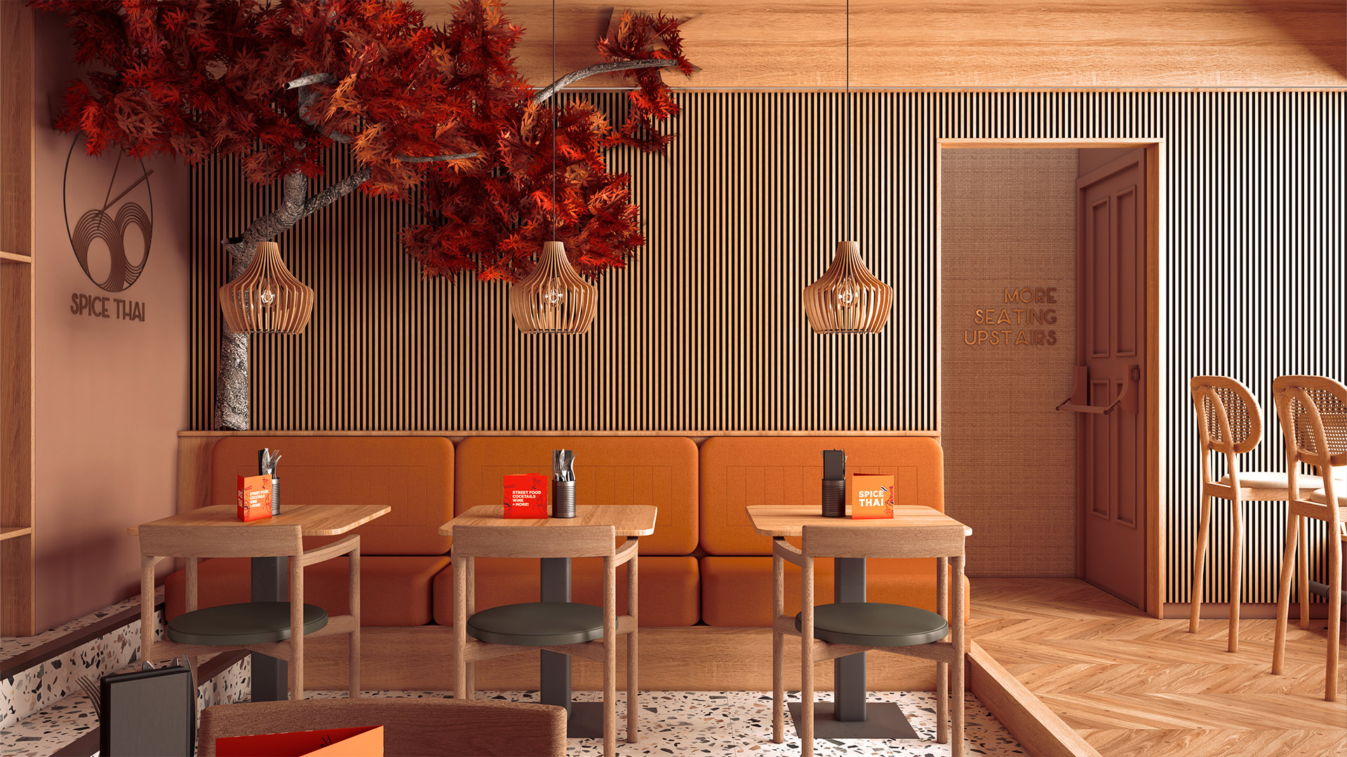 Our approach to the design of the Spice Thai restaurant was to avoid the obvious, the standard cliches and the kitsch. The emphasis was on subtle minimalism with warm natural materials and textures – slatted oak decor and terrazzo tiles – providing an informal contemporary feel. The combination of materials reflect a thoughtful fusion of traditional Thai warmth with contemporary design principles.
